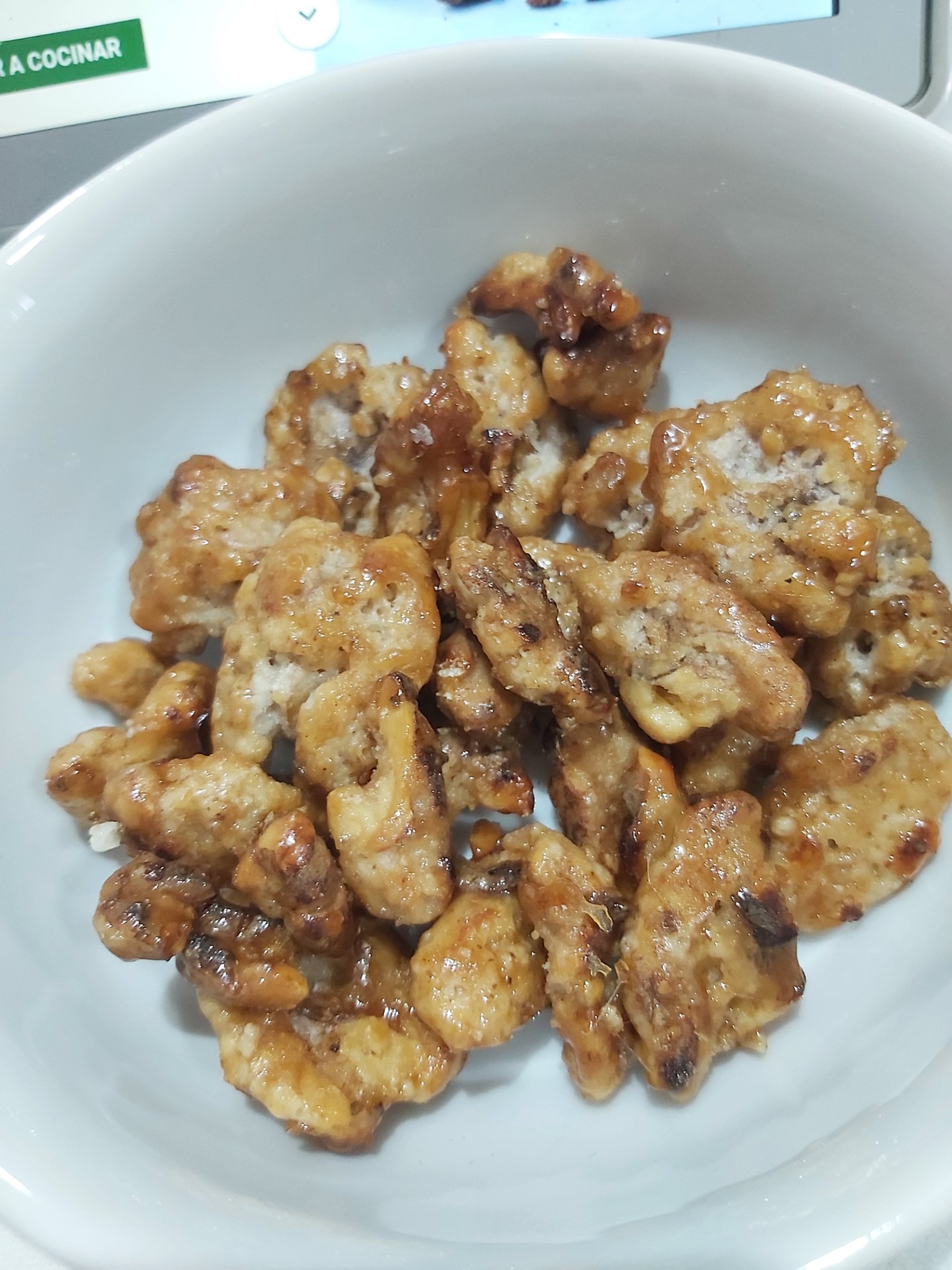 Coloque en el vaso la mezcla de frutos secos variados, el azúcar, el agua y mezcle con la espátula, cocine 7 min/120°C/ vel cuchara . Mientras tanto, caliente una sartén antiadherente a fuego medio.