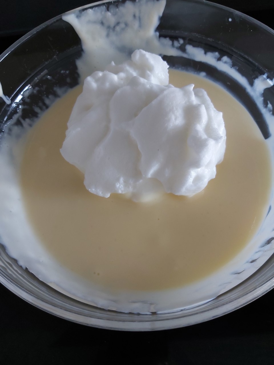 Apartamos en un recipiente y la dejamos enfriar un poco añadimos las claras montadas a la crema con movimientos envolventes.