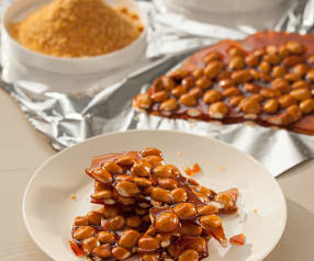 Ponga el azúcar y el agua en una sartén antiadherente y caliente a fuego medio hasta que se funda y adquiera un color dorado. Añada las almendras, deje que se caramelicen y vierta sobre papel de aluminio o lámina de silicona. Deje enfriar (aprox. 1 hora).
