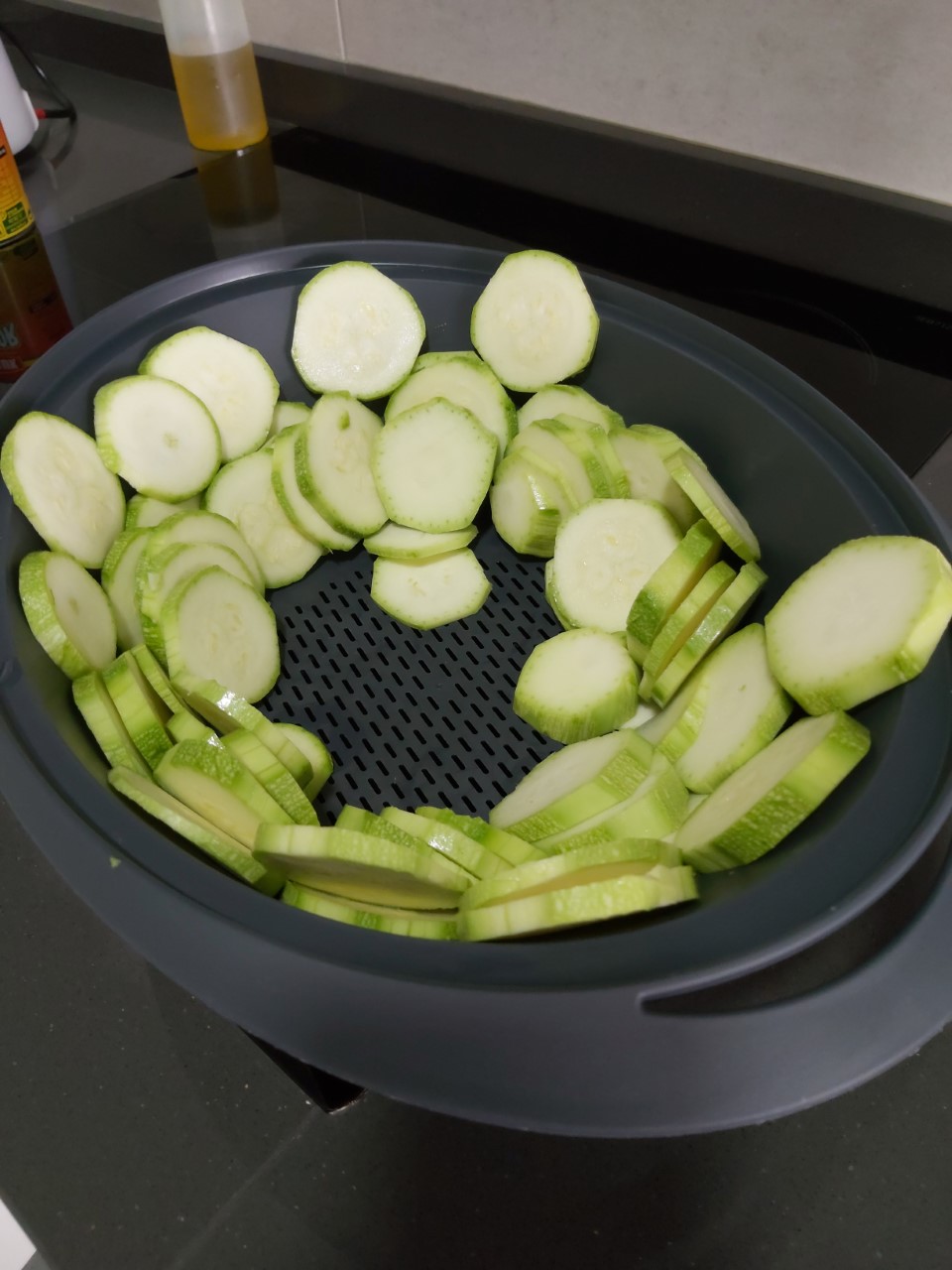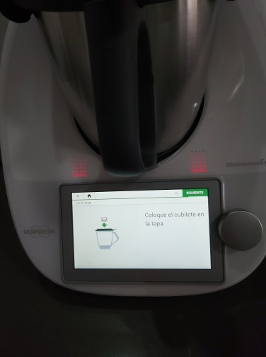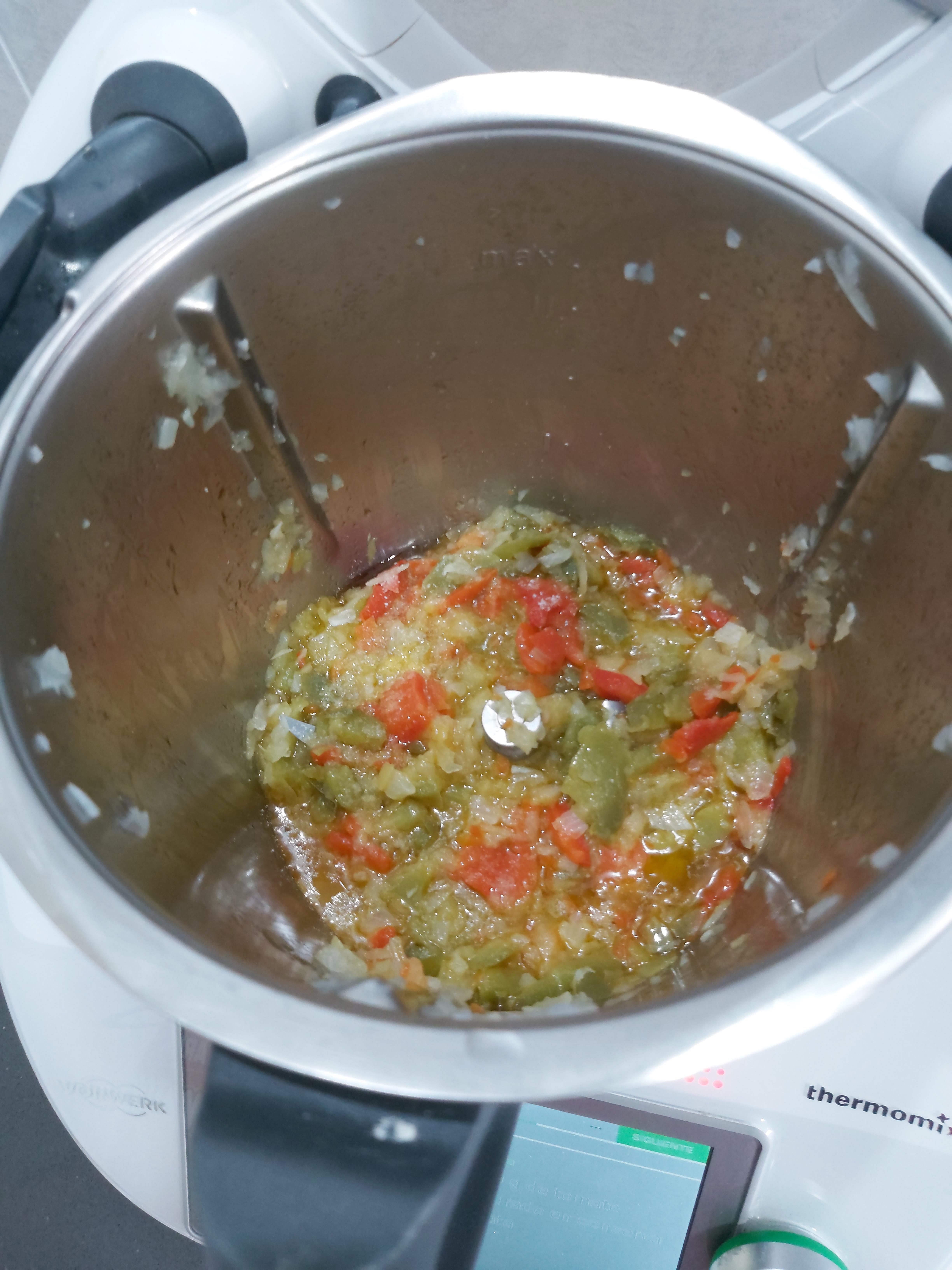 Hoy he hecho un pisto de primer plato. La receta de cookidoo está buenísima, pero a mi me gusta la verdura mas entera, así que,he sofrito las verduras excepto el calabacin, este, lo he cortado en rodajas y lo he colocado en el varoma en batería , osea, alrededor de las paredes del mismo . Así deja abierto los agujeros para que suba el vapor. Lo pongo encima mientras se cuece el tomate , cuando termina lo echo en el vaso y le doy cinco minutos más con la misma temperatura que estaba el tomate y las verduras.