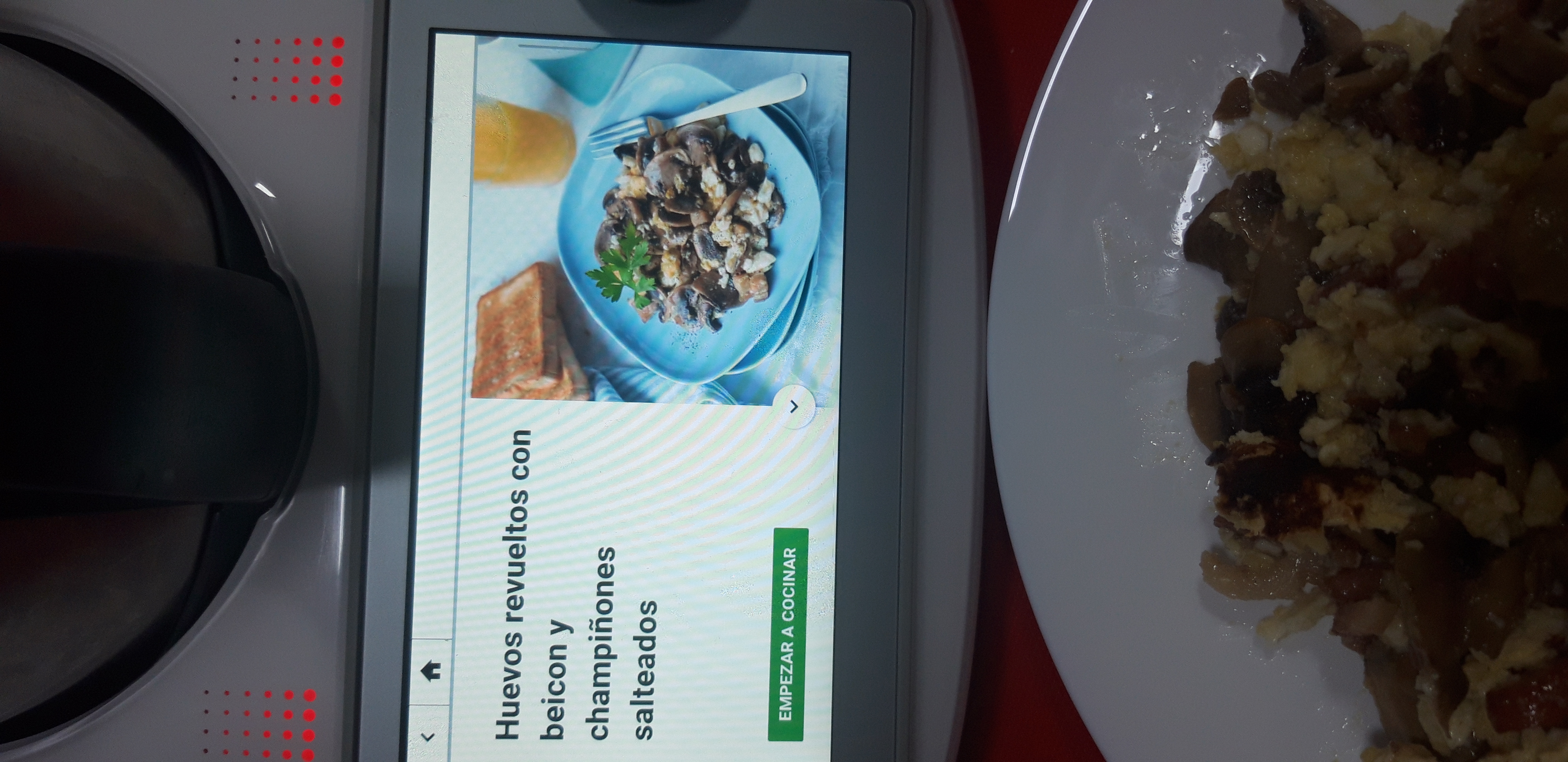 Ponga el agua en el vaso. Introduzca el cestillo y pese los champiñones. Programe 3 min/Varoma/vel 1. Con la muesca de la espátula, extraiga el cestillo. Vacíe el vaso.Ponga en el vaso 10 g de aceite y el beicon y, sin poner el cubilete, sofría 4 min/120°C/vel .Añada al vaso los champiñones del cestillo e inicie Alta Temperatura . Ponga en un bol y reserve.Huevos revueltosPonga en el vaso 10 g de aceite y caliente 1 min 30 seg/120°C/vel 1. Mientras tanto, separe las claras de las yemas.Añada las claras y la sal y programe 4 min/120°C/vel .Agregue las yemas, mezcle muy bien con la espátula despegando el huevo del fondo del vaso y programe 2 min 30 seg/120°C/vel 1. Mezcle con los champiñones y beicon reservados, espolvoree con la pimienta y sirva inmediatamente.
