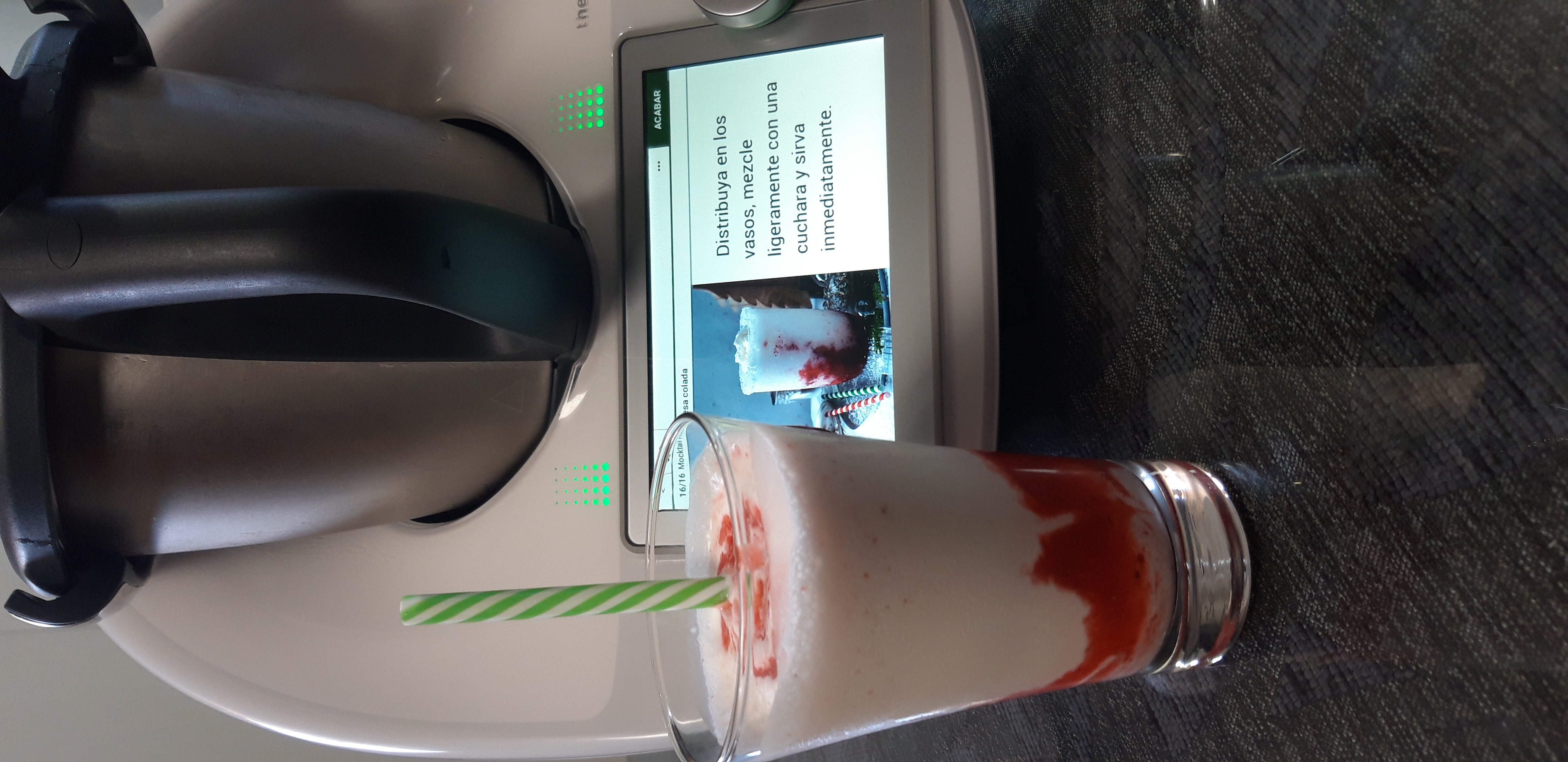 300 g de fresas congeladas (ligeramente descongeladas)60 g de azúcar200 g de zumo de piña200 g de leche de coco100 g de nata (35% de grasa)300 g de cubitos de hielo.